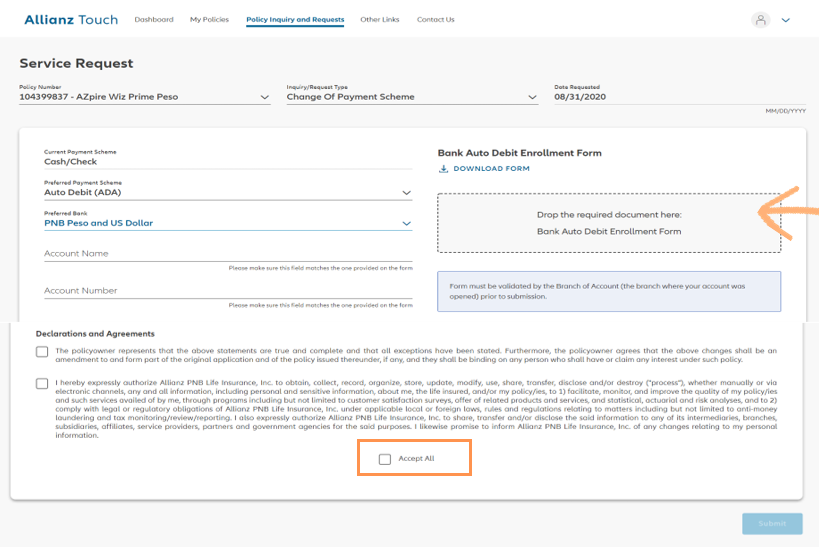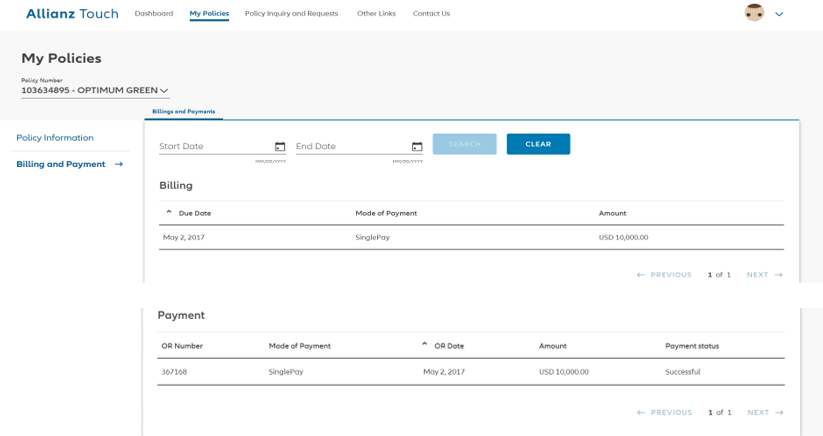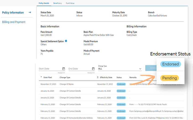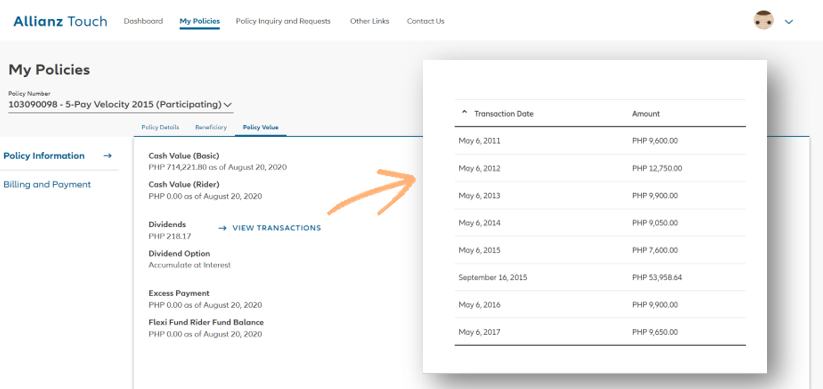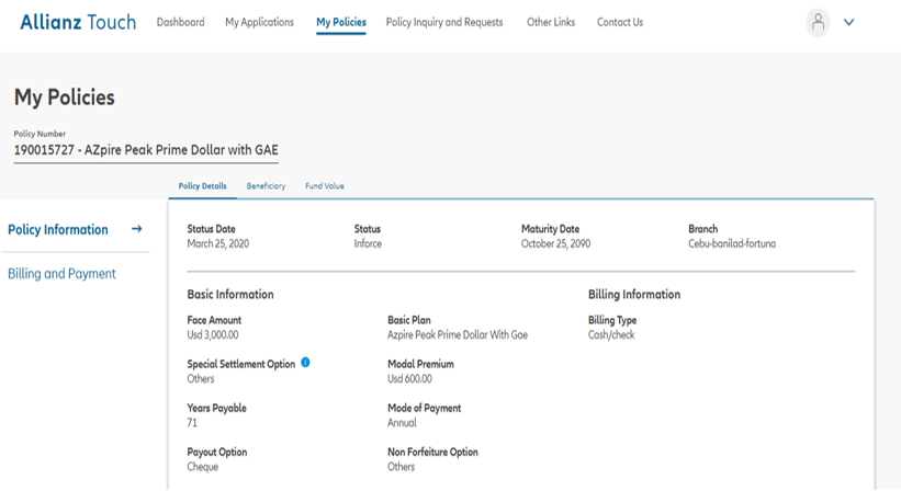3 Policy Value – shows the value of the policy as of date. This information is only available to Traditional Policies.