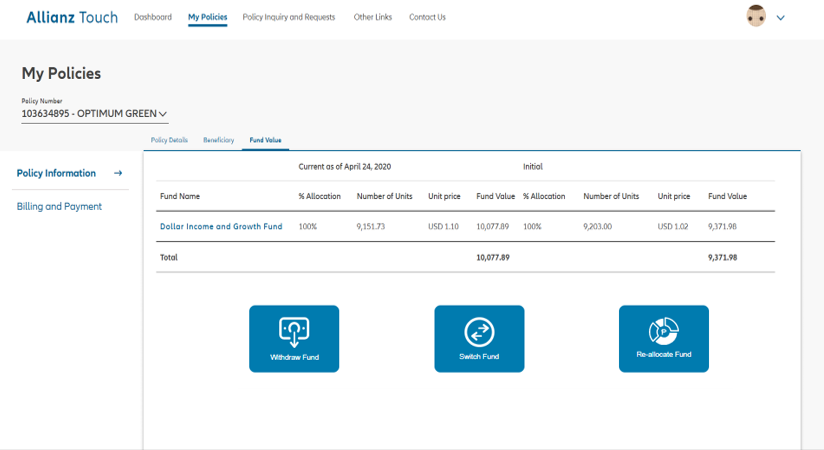 4 Fund Value – shows the initial and current fund value of the policy. This information is only available to Unit-Linked Policies.