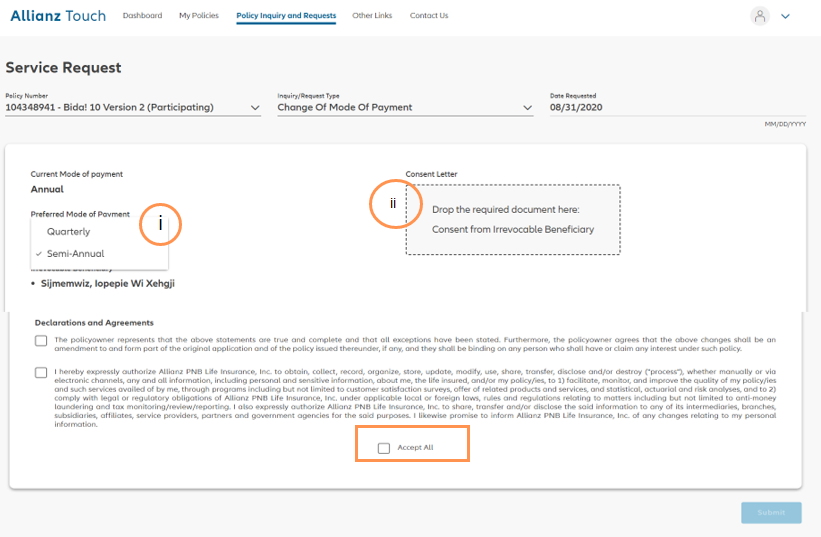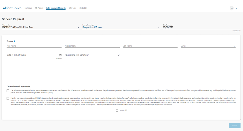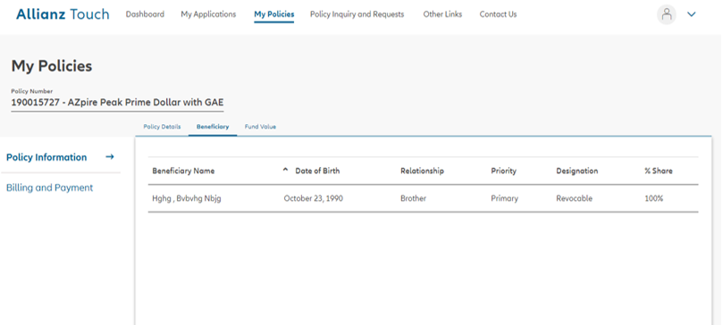 2 Beneficiary – shows the details of the Policy Beneficiaries.