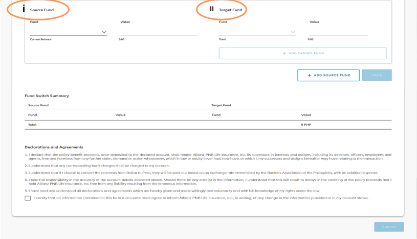 Owner will define the source fund and amount to be switched (based on unit of measurement defined).