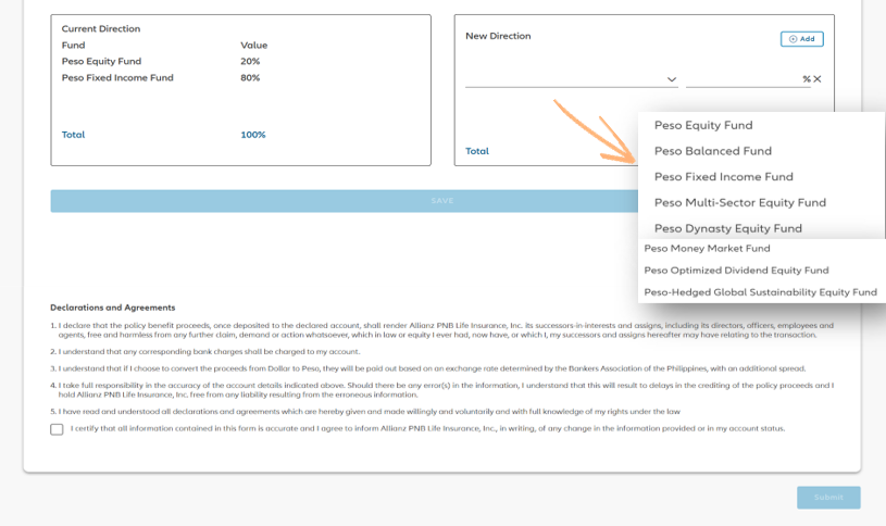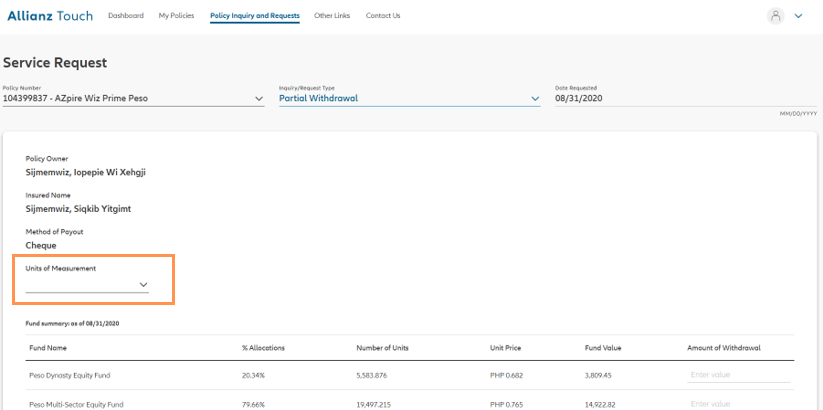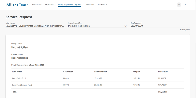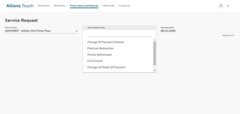 Fund related transactions may be triggered in this window such as: Fund Withdrawals, Fund Switch, and Re-allocate Fund. This will redirect the owner to Policy Inquiry and Requests dashboard.