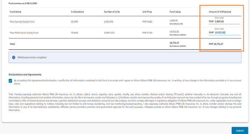 Owner may request to withdraw based on the following units of measurement: Amount, Percentage, or Fund Units.