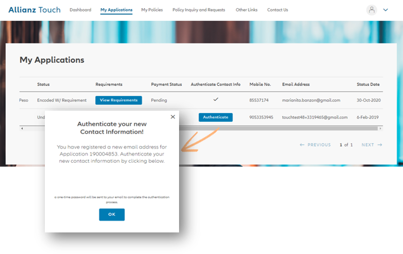If multiple applications have different contact information and is not yet authenticated, an “Authenticate” button will be visible in the dashboard.